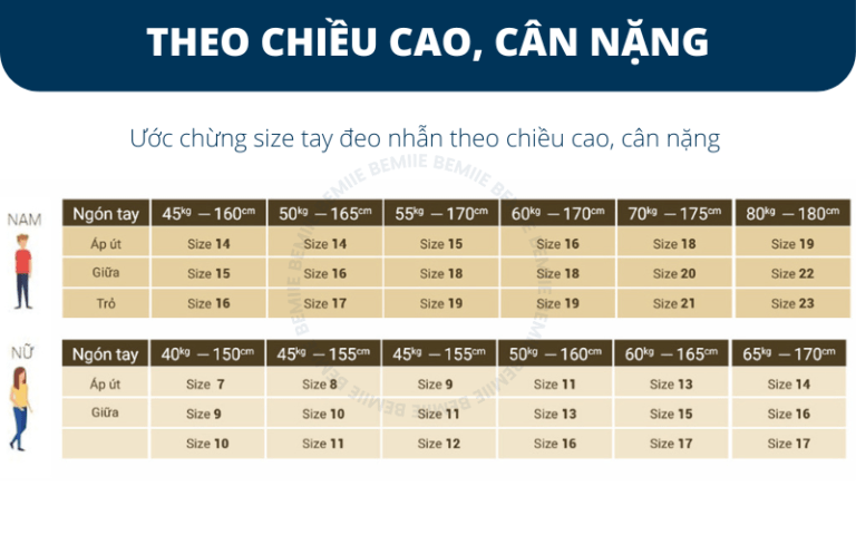 Nếu bạn dành tặng nhẫn kim cương, nhẫn thiết kế riêng, nhẫn bạc cho người thân, người yêu hoặc bạn bè mà chưa biết ni tay của họ, thì bạn có thể dựa vào cân nặng và chiều cao để ước chừng: